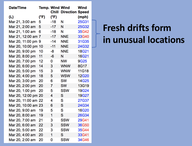 Above is a 24 hour data dump from Lofty Lake Peak (11,186') showing recent north and northeast wind trends.
