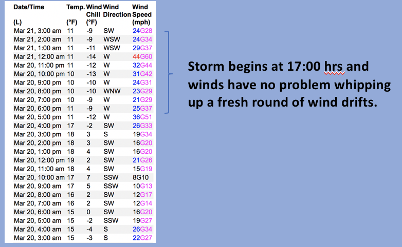 Nowcast- Apologies for Monday's blown weather forecast. I got the deets tangled in my brain for both strength and timing of yesterday's storm as it was weaker than advertised and arrived early this morning. But hey... better Nate than lever... it snowed! At o'dark thirty, clouds are beginning to head east in the wake of our underwhelming storm which delivered just two inches of snow. Temperatures are in the low to mid teens and westerly winds blow in the 30's near the high peaks. It's spring and that means riding and turning conditions are aspect and elevation dependent. Low elevation solars offer dust on crust, whilst mid and upper elevation, wind sheltered polars, offer cold creamy snow.