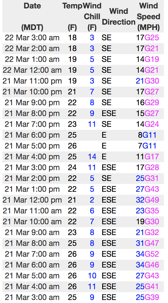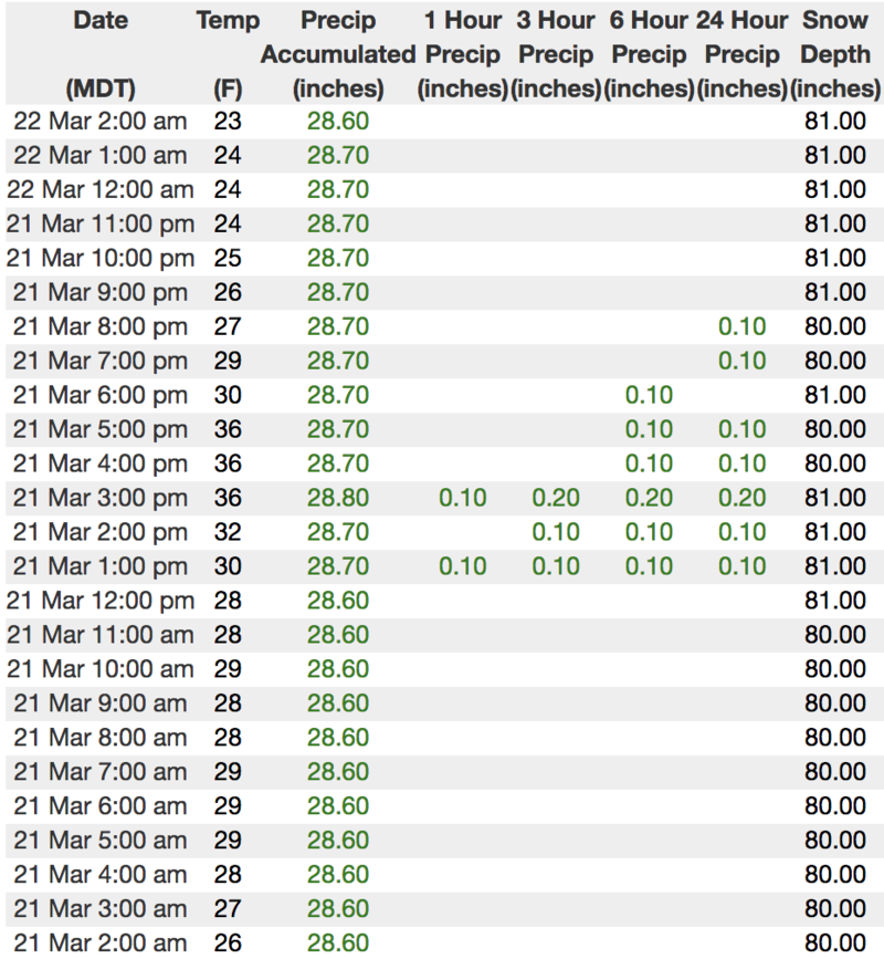 Above is hourly data from Trial Lake (9,945') and Windy Peak (10,662'). To view more regional weather stations click here.
