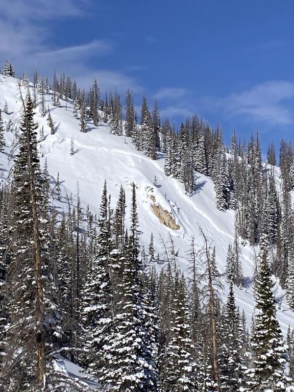 Michael Davis was in the Gold Hill zone yesterday and caught sight of these two slides. The top image is fairly recent and perhaps triggered earlier in the day. While small and pockety, the main take home is it broke to weak snow near the ground and could definitely ruin your day if it slammed you into a tree. The second image is of an older, more connected slide, which I think is a repeater and illustrates similar properties. For more on Michaels travels and a most excellent trip report click HERE.