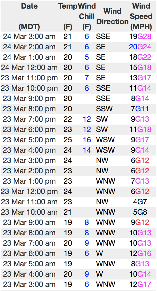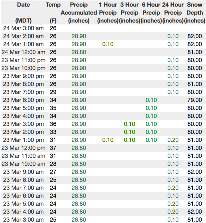 Above is hourly data from Trial Lake (9,945') and Windy Peak (10,662'). To view more regional weather stations click here.