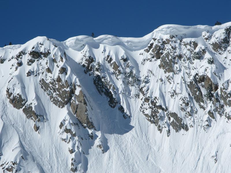 Cornices are ginormous and may break back further than you might expect. You definitely wanna give these large, unpredictable pieces of snow a wide berth and not ruin someones day below by inadvertently knocking a boxcar size piece of snow down on them.