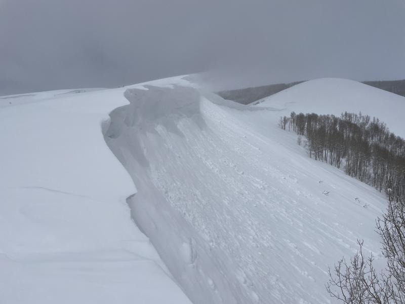 Yesterday's wind (blowing left to right in the image above) had no problem stripping snow from the windward side of the ridge and depositing it on the leeward side. I found mid elevation corni super reactive to my additional weight and also a solid indicator to the predominate direction of winds and where I will find fresh drifts reactive to my additional weight.