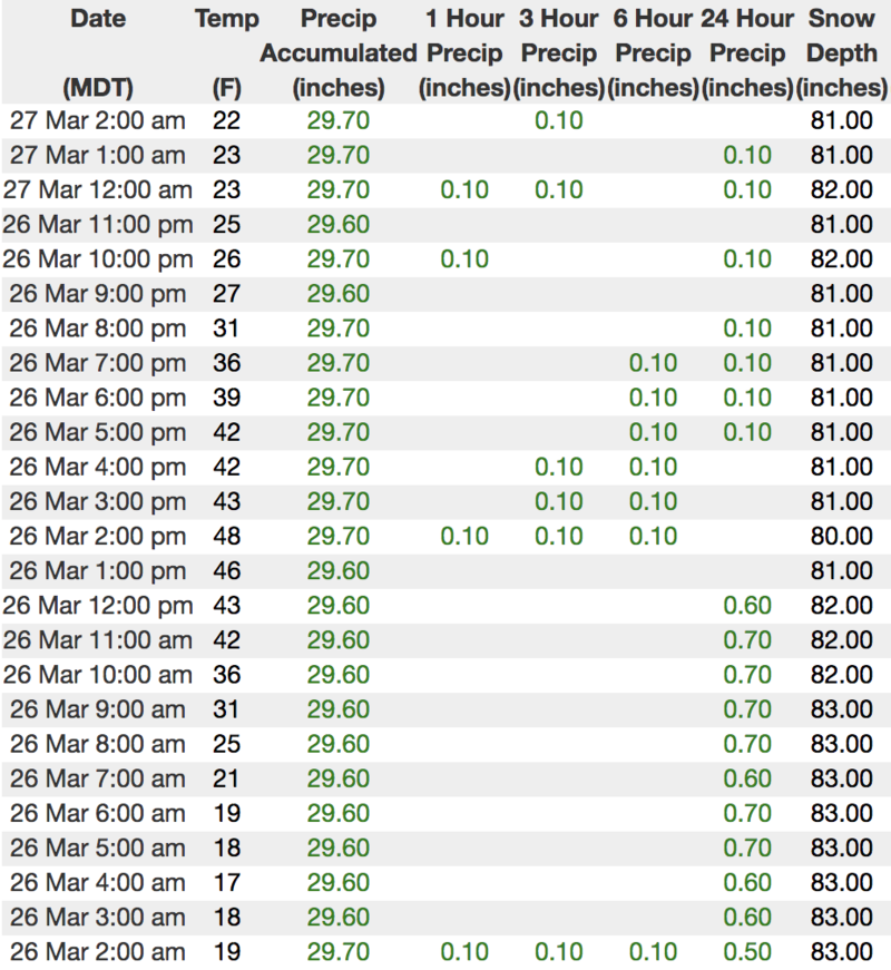 Above is hourly data from Trial Lake (9,945') and Windy Peak (10,662'). To view more regional weather stations click here.