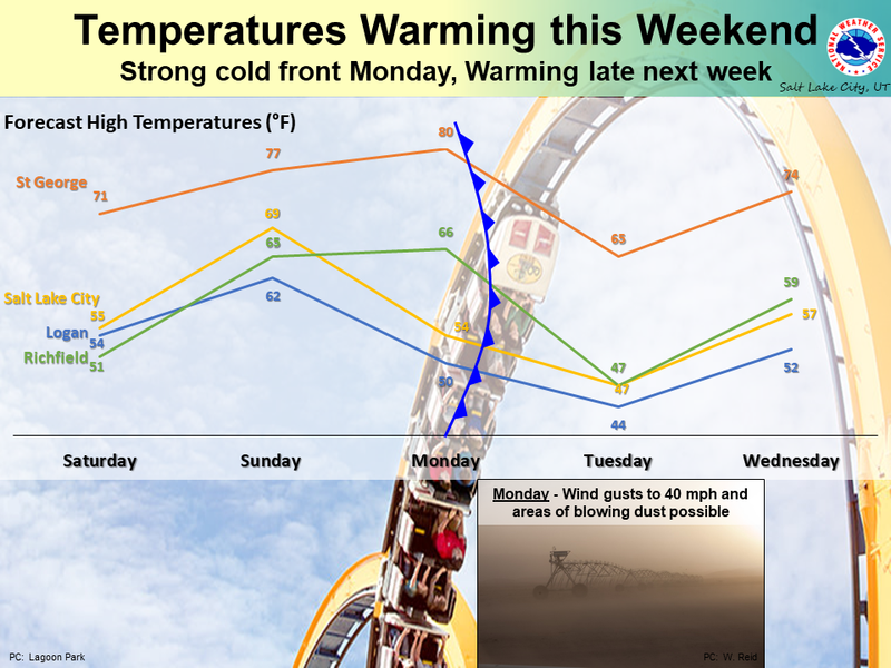 Sunny and continued warm and dry for Sunday and then look for very strong winds developing Monday, before a robust cold front slides into the region overnight into Tuesday. Lots of blow, but not much snow.