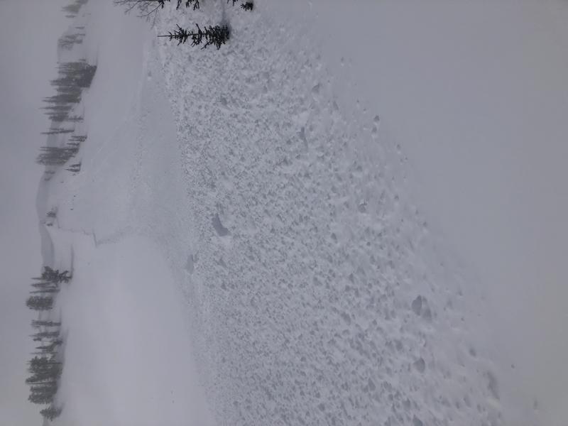 Most of our recent wind drifts have settled, become comfortable in their own skin, and aren't gonna be nearly as touchy as in the past few days... and that's good news. However, it's not full on green light conditions and you don't wanna trip over yourself running the yellow light, just to get t-boned at the intersection, especially in the wind zone where this weekends slabs are now camouflaged with a few inches of fresh snow. While not quite as widespread as in recent days, both old and newer drifts react to our additional weight none-the-less, and once triggered, they're gonna pack a dangerous punch.