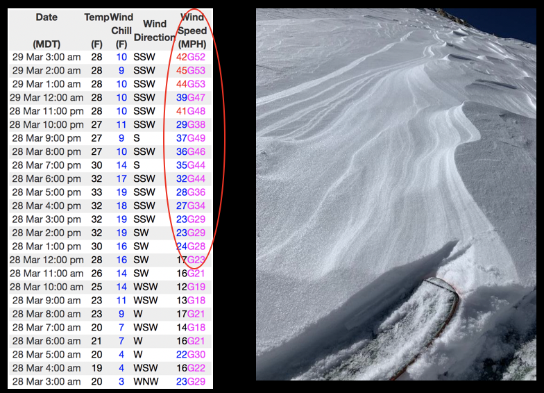 The image on the left represents a 24 hour data dump from Windy Peak (10,661') clearly showing an uptick in winds throughout the night. The image on the right is a result of powder ruining gusts, etching snow on the windward side of the slope and delivering it to leeward terrain facing the north half of the compass..