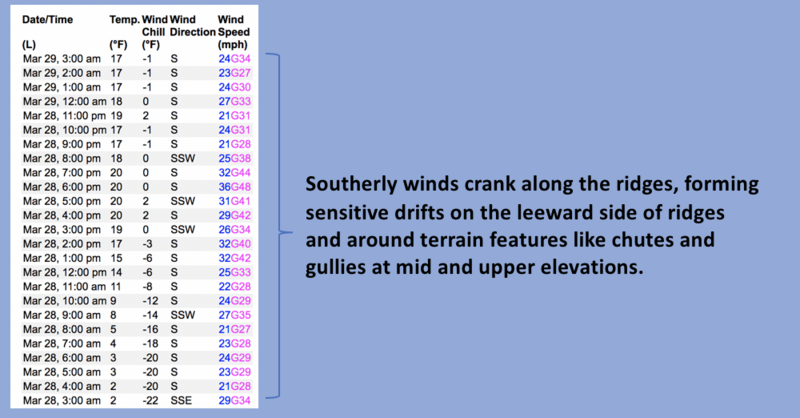 Forecast- Look for increasing clouds with a snow shower or two as temperatures climb into the mid 30's. Southerly winds crank into the 30's and 40's at mid elevations while punishing the ridges with gusts into the 70's. Snow develops late in the day and continues through tonight.