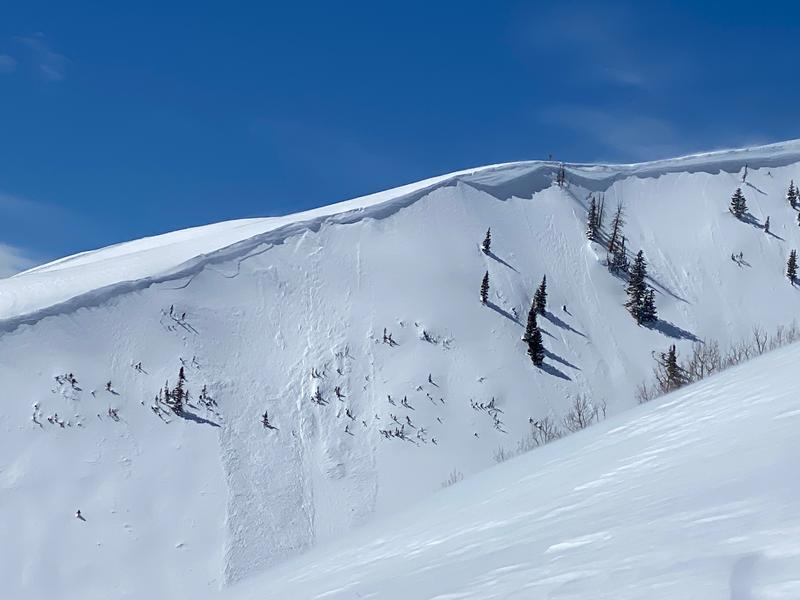 A natural cornice fall yesterday triggers this fresh wind drift on a steep, east-northeast facing slope in Upper Weber Canyon.