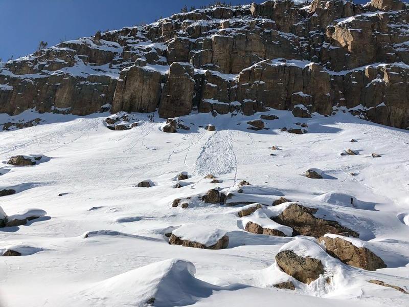 With such a supportable slab on top of the PWL, a slope may have many sets of tracks on it and still slide if someone hits a thin spot in the snowpack near a rock or bush hidden under the snow, like in the image above.