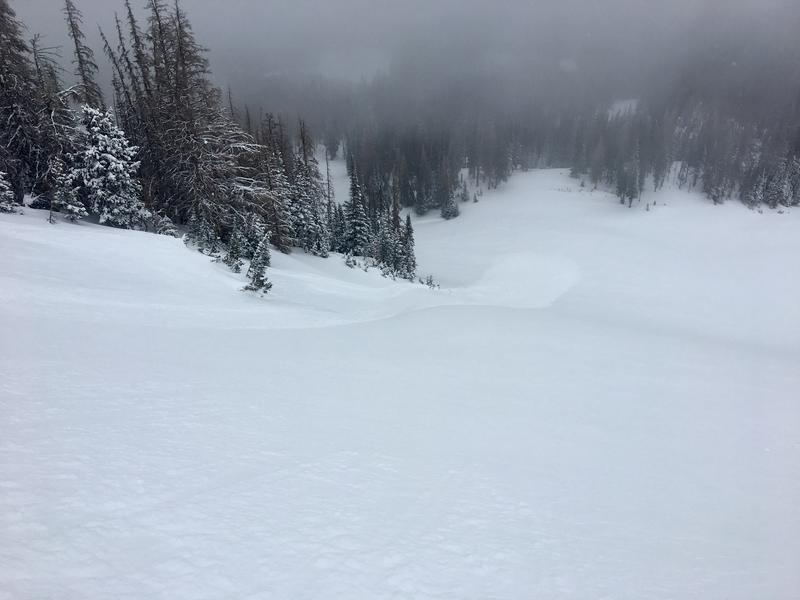 A couple drainages away from each other, both Ted and Dave Kikkert found similar conditions.... sensitive drifts, breaking 12"-24" deep, along the leeward side of upper elevation ridges. While isolated to the wind zone, once initiated, yesterday's soft slabs and shallow sluffs had no problem picking up speed on the slick bed surfaces formed during last weeks warm spell and ran faster and further than you might expect.