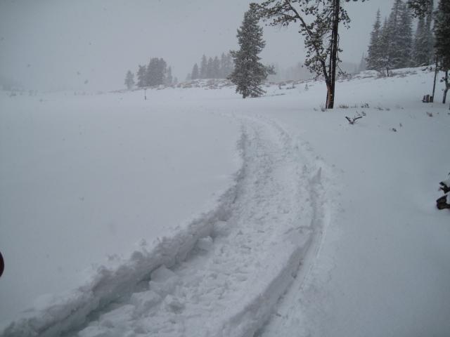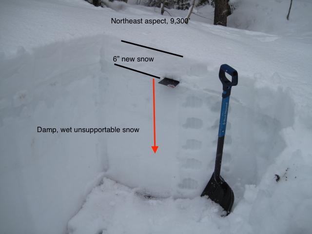Ted found it rough going with barely supportable conditions yesterday near Gold Hill and says... "As soon as I left the groomed trail I was sinking into damp unsupportable snow with water at the ground level. This was at the 8,700' elevation." Ted also adds... "I was finding similar snow conditions at 9,500' with slightly more new snow, but the snow was still unsupportable and damp to the ground. I sunk to my knees once I stepped off the machine."
