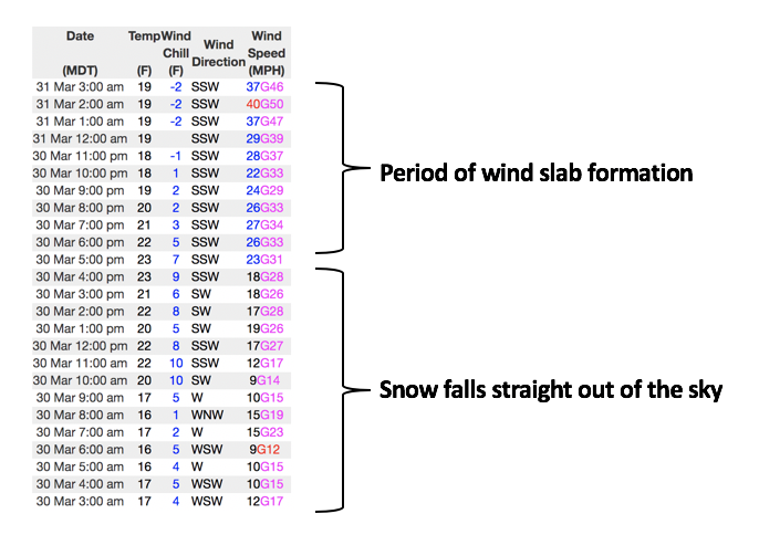 Under mostly cloudy skies, a band of light snow showers slide to the north of our zone as I type, and current temperatures register in the low to mid 20's. The spoiler to recent windless days is the obvious... the winds! Southwest winds increased yesterday afternoon, bumping into the 20's and 30's, and ramped up even further early this morning, now registering 30-50 mph along the high peaks. Late March riding and turning conditions are about as good as they get, especially on mid elevation, wind sheltered slopes.