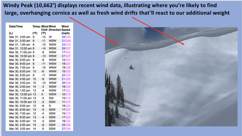 Well developed cornice like the ginormi... corni in the image above, are a double edged sword. While great indicators to indicate predominate wind direction and potentially wind drifted terrain, also remember these beasts can unpredictably break in front or behind you and need to be given a huge berth.