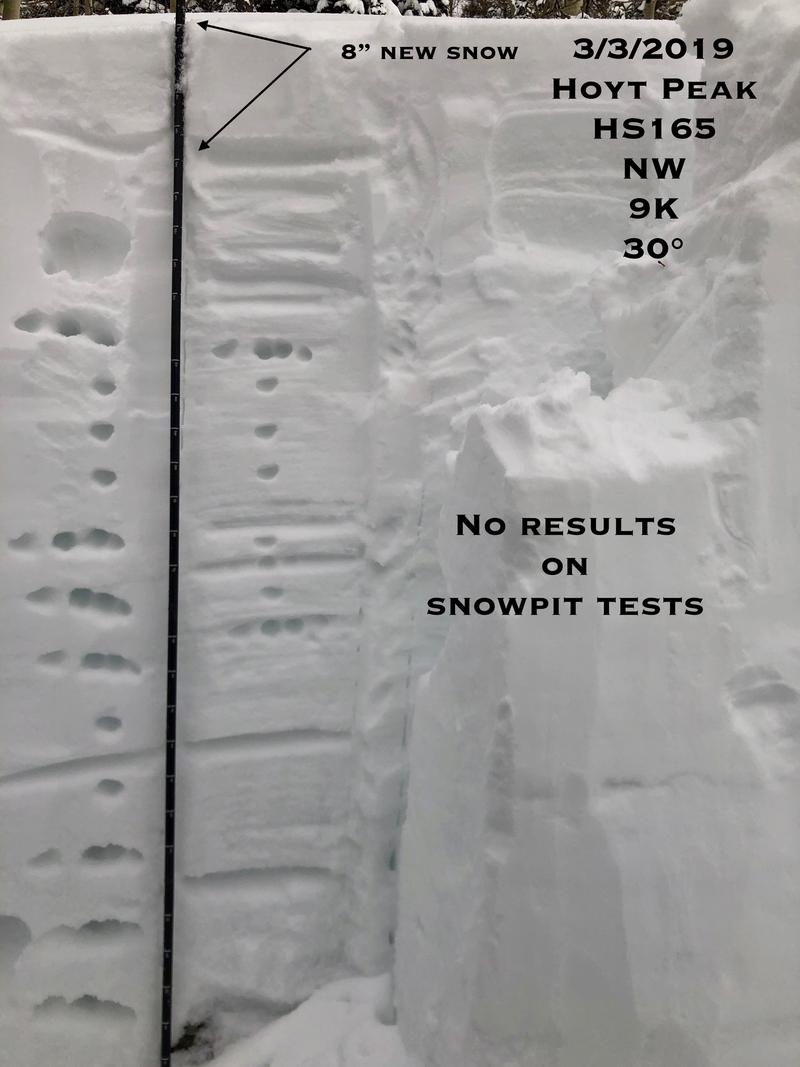 JG was near Hoyt Peak and has encouraging news.... "Just out for a quick, afternoon cruise. The little dribbler storms during the week and last nights over-producer have freshened up the skiing making for great riding conditions. Spent a little time looking at the snow and the last week and a half have really made a difference in the snowpack's stability. Definitely feeling like we've made a swing in the right direction in overall stability. No results in column and extended colum tests. It's still easy to identify weak layers in the pack but they seem strong and weren't responding to stability tests. "