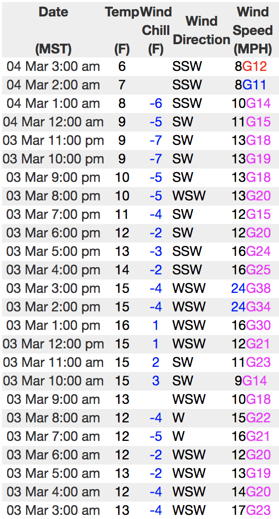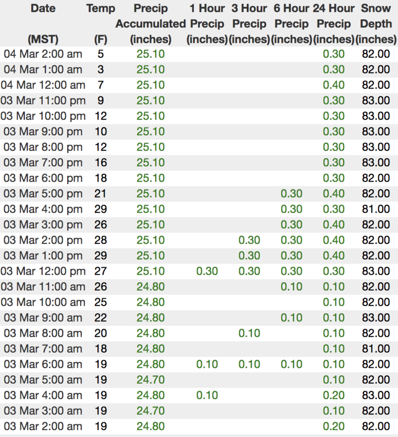 Above is hourly data from Trial Lake (9,945') and Windy Peak (10,662'). To view more regional weather stations click here.