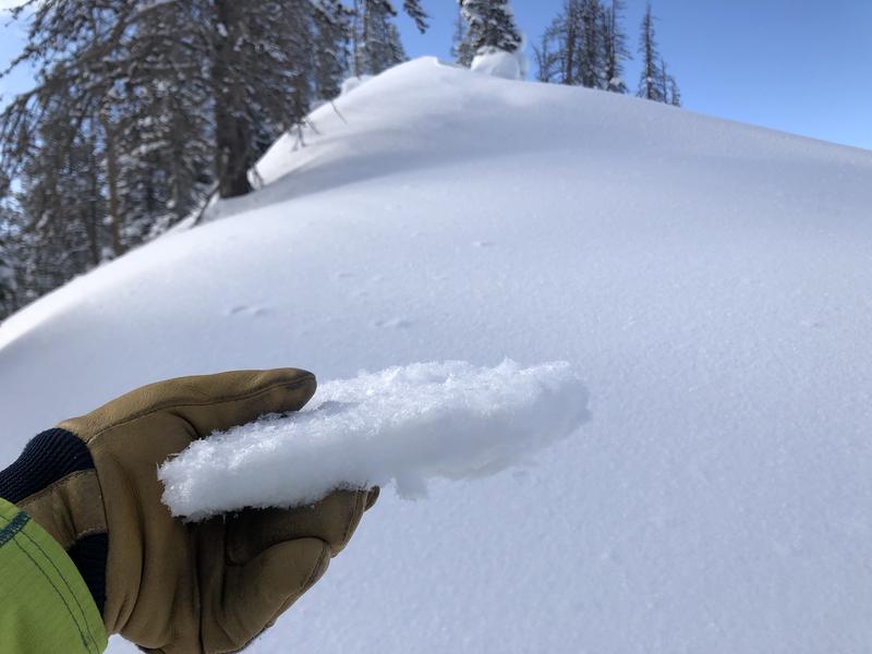 Here's what our weak snow near the ground looks like and Cody's take... "4-6 mm Depth Hoar crystals found in our deep snowpit in the Humpy Creek drainage. Hard to trust a depth hoar snowpack even when buried this deep..."