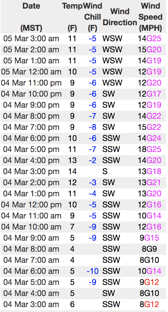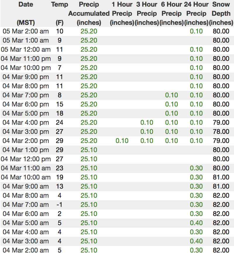 Above is hourly data from Trial Lake (9,945') and Windy Peak (10,662'). To view more regional weather stations click here.