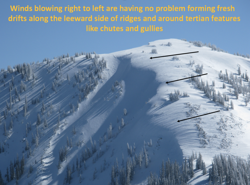 Winds ramped up early yesterday and had no problem finding an abundance of light density to blow around and form fresh drifts sensitive to our additional weight. With a storm on our doorstep and winds forecast to ramp up throughout the day, I expect today's drifts will become more widespread, more connected, and by late in the day, may deeper than you might expect. As the day wares on remember to look for and avoid any fat, rounded piece of snow, especially if it sounds hollow like a drum.
