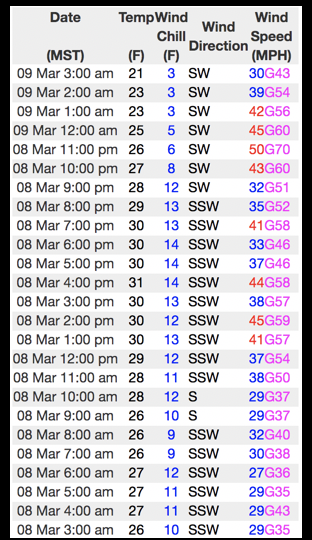 A 24 hour data dump from Lofty Lake Peak, 11,186', clearly shows winds cranking along the high peaks.