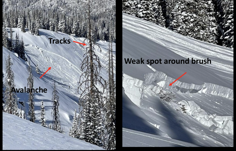 Strong snow on weak snow often displays false signs of stability because a slope may have many sets of tracks on it. But... a slope can still slide if someone hits a thin spot in the snowpack near a rock or bush hidden under the snow, like in the image above.