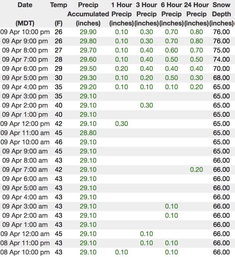 No updated mesowest data... note the time stamp on hourly snow and water totals from Chalk Creek (9,169')