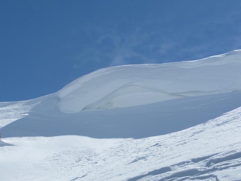 Cornices are ginormous and may break further back than you might expect. As the mercury begins its uphill migration this week, we'll definitely wanna give these huge boxcar pieces of snow a wide berth.