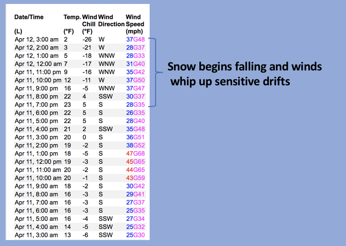 A 24 hour data dump from Windy Peak (10,662') shows strong winds will have no problem whipping fresh storm snow into sensitive drifts in upper elevation terrain.
