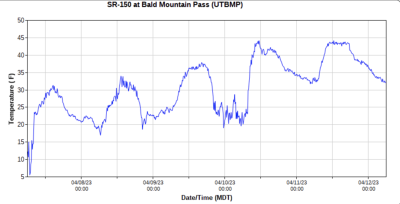 It has been over 48 hours without below freezing air temperatures (see graph below from Bald Mountain Pass), and partial clouds overnight would have limited any cooling of the snow to the night sky.