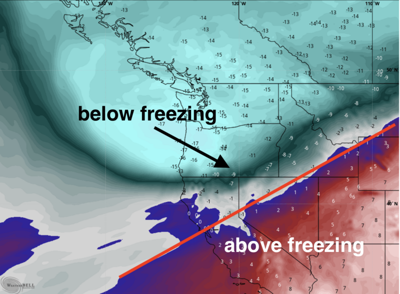Today will have increasing clouds as a cold front approaches. Temperatures will quickly climb into the 50s F and strong winds from the south will continue. The cold front doesn't arrive until tonight (scroll to the the bottom to see a screen shot of air temperatures at 10,000 ft) when it should bring below freezing temperatures. Some snow will fall tomorrow but maybe only an inch or two.