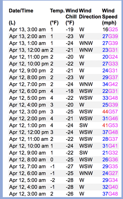 A 24 hour data dump from Windy Peak (10,662') show recent strong winds which have no problem whipping fresh storm snow into sensitive drifts in upper elevation terrain.