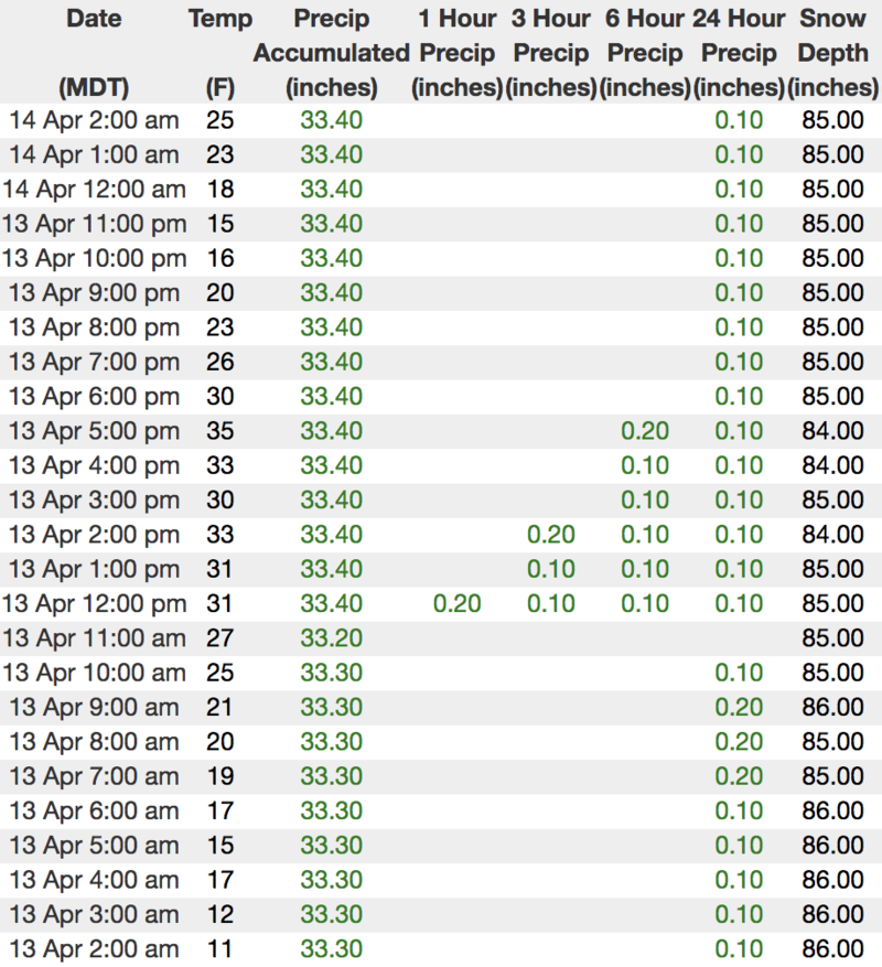 Above... hourly temps, snow, and water totals from Trial Lake (9,945')