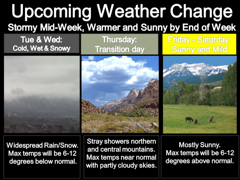 A series of weather disturbances slide through northern Utah today and tomorrow. A strong system is slated to impact the region late Monday, lingering through midweek. Strong high pressure builds late in the week.