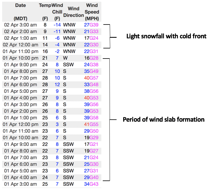 Above is a 24 hour data dump for Windy Peak (10,662') illustrating recent winds along the high peaks.