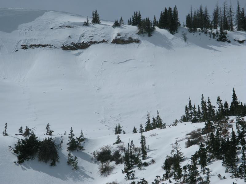 We spotted this interesting pocket yesterday which was most likely triggered a few days ago. It looks like a damp piece of snow dribbled from the steep rock band, crashed onto the slope below, and broke to the Jan/Feb weak layer.
