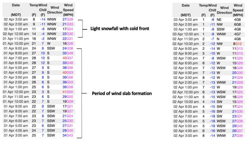 Above a 48 hour data dump for Windy Peak (10,662') illustrating recent winds along the high peaks, helping to explain how, where, and why drifting occurred.