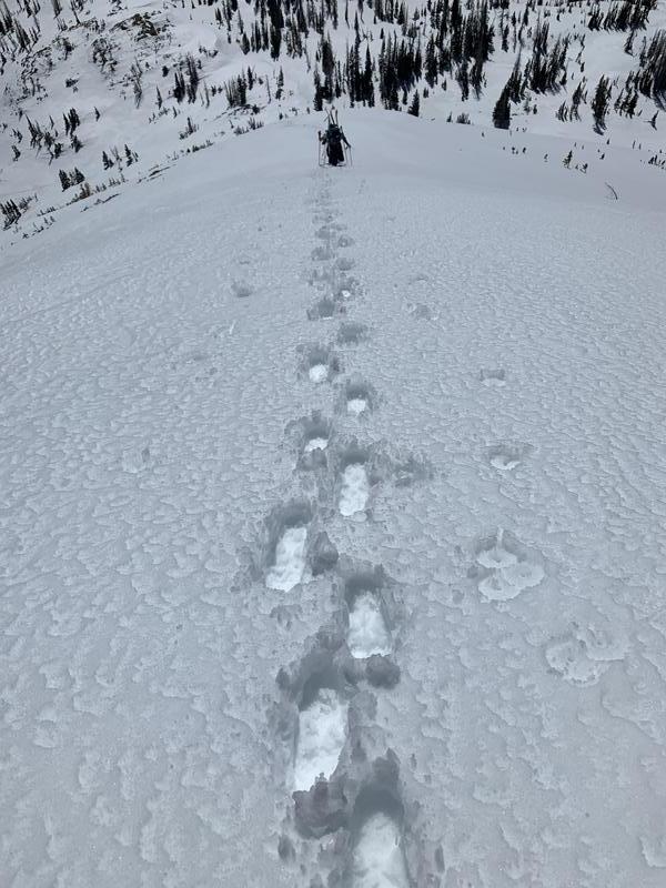 Weston Shirey putting the booter in to access high alpine terrain around the Crystal Lake zone yesterday. He reports.... "Overall we saw about 6" of damp or corn snow sliding on a very hard crust layer just below, while roller balls and active wet loose slides were easy to ski cut on steep south terrain."