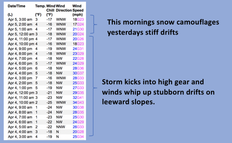 A 24 hour data dump from Windy Peak (10,661') illustrates where you're likely to find wind drifts that'll react to our additional weight.