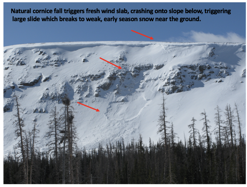 Tough to identify, particularly when it's all white, but common theme is... repeater avalanche terrain. Steep, rocky slopes, especially those facing the north half fo the compass, that avalanched near the ground earlier this season and have remained thin and weak all season.
