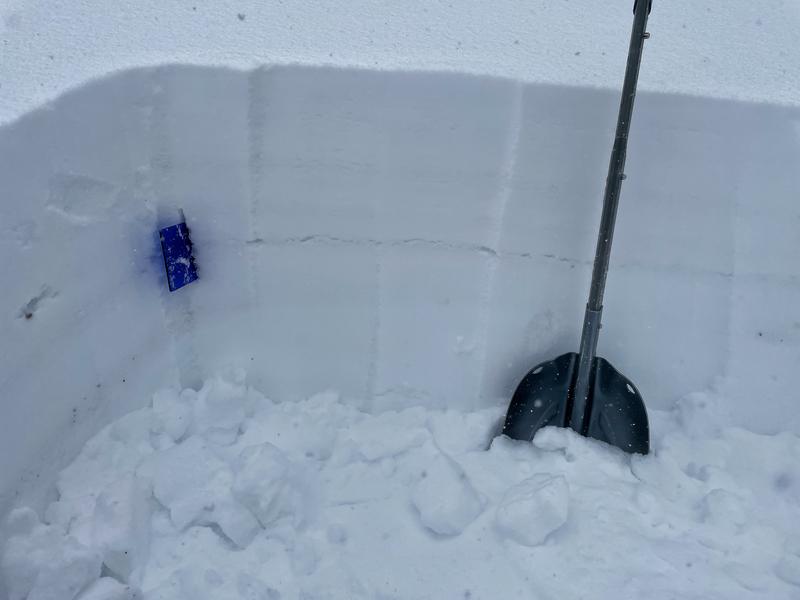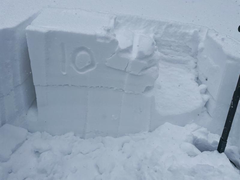 I did multiple extended column tests on this layer. It would only break under my shovel (ECTN) and not propagate. However, when I tapped on the remaining 60 cm of the column (the full column width of a ECT is 90 cm), it would break across the whole column after 10 taps. What does this mean? (1) At my location at that time, it wasn't too concerning, (2) It tells me that it could exist in other places and possibly be more likely to produce an avalanche, & (3) Later this week I'll be hunting for it.