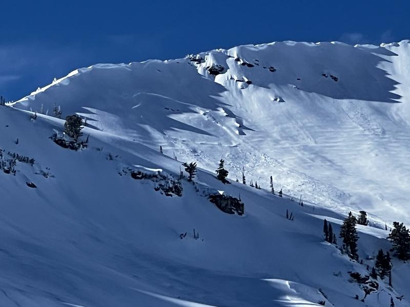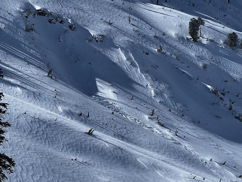 A small wind-pocket with fresh debris on Ben Lomond headwall - this most likely avalanched overnight or early Saturday morning.