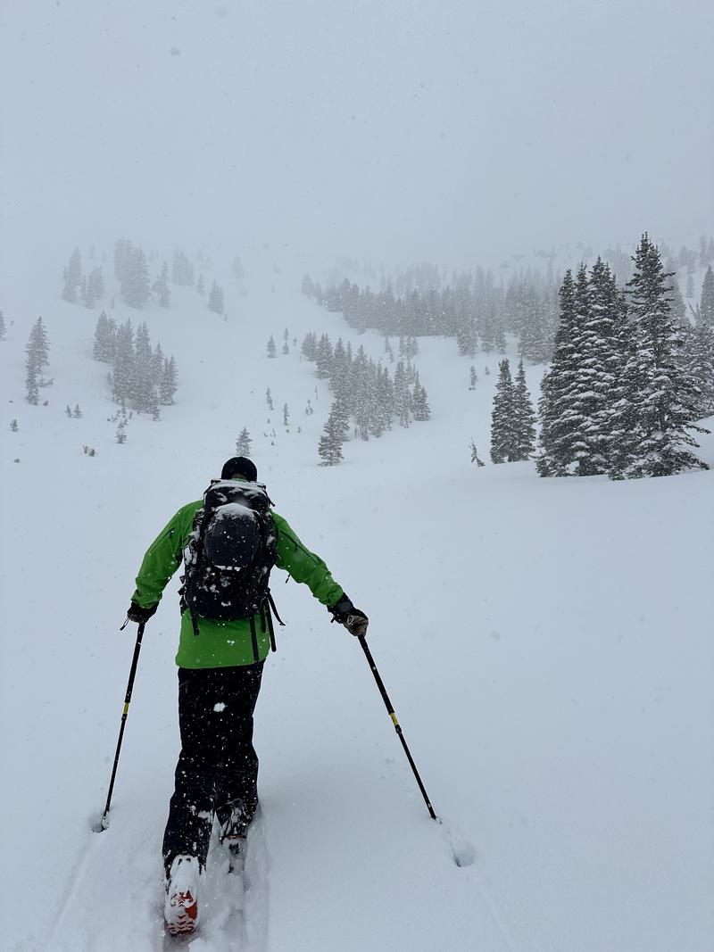 It was a beautiful day traveling through the mountains. Visibility was intermittent, but there were obvious signs of recent soft slab avalanches and easy sluffing from yesterday. The few periods of sun yesterday, as well as this morning, increased the snow density from generally low to more medium density, giving it a bit more body. Today, while traveling, the upper few inches of snow seemed to be more cohesive than yesterday, making it easy to initiate D1-1.5 soft storm slabs, especially in areas that seemed to have experienced some wind yesterday afternoon. Outside of the wind zone, the snow was still sensitive, and it was easy to initiate fast and far-running sluffs within the new snow. All the avalanches that I witnessed today seemed to fail either within the old snow/new snow interface (those avalanches that were a bit more cohesive and failed larger) or within a density change just a few inches deep.
