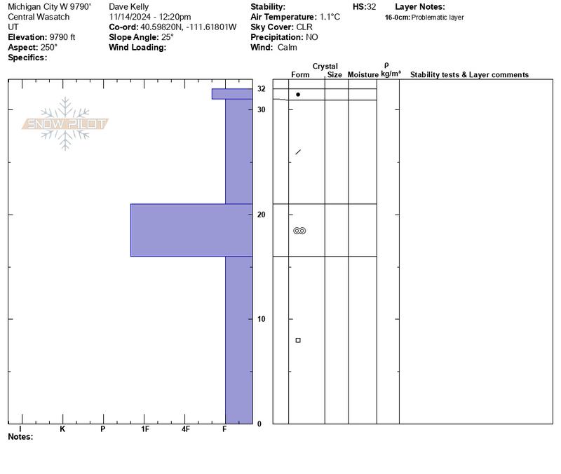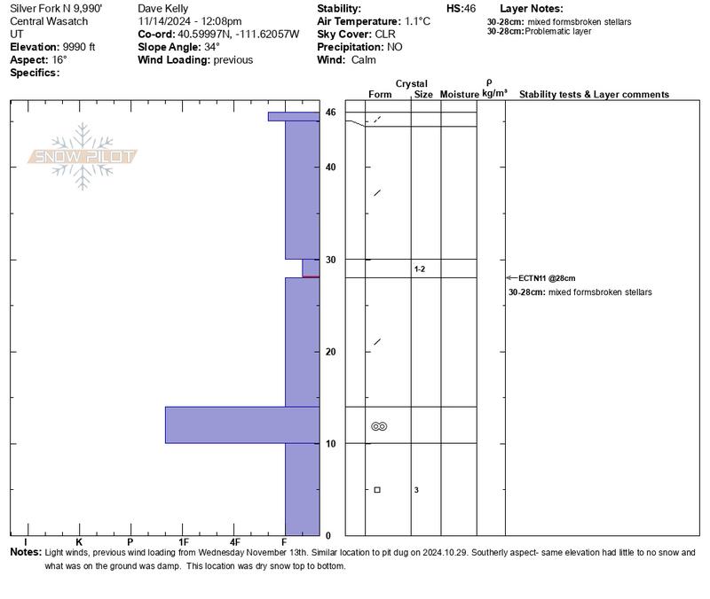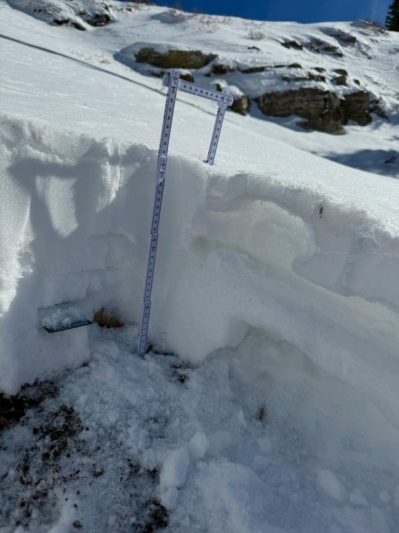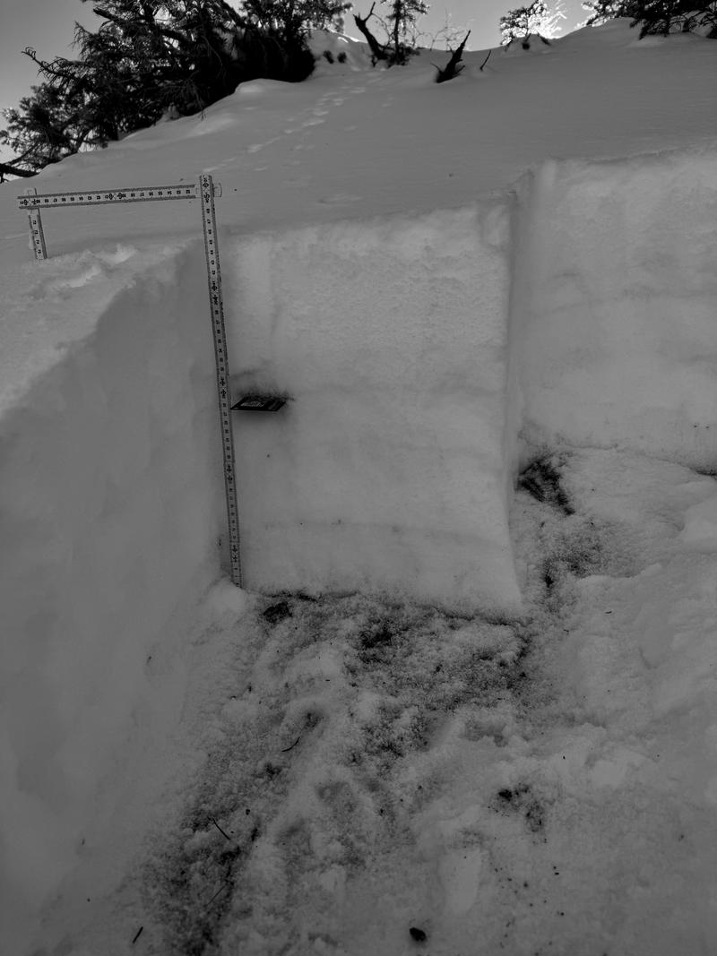 Snow pit was dug in a similar location to this one from October 29, 2024. Snow at the same elevation on the southerly aspects was damp to non-existent (see below photos). The snow in this pit was primarily dry and the rain layer from October was in the same place about 4" from the ground. Card marks weakness and brown dust layer marks rain crust. Total depth was 18".