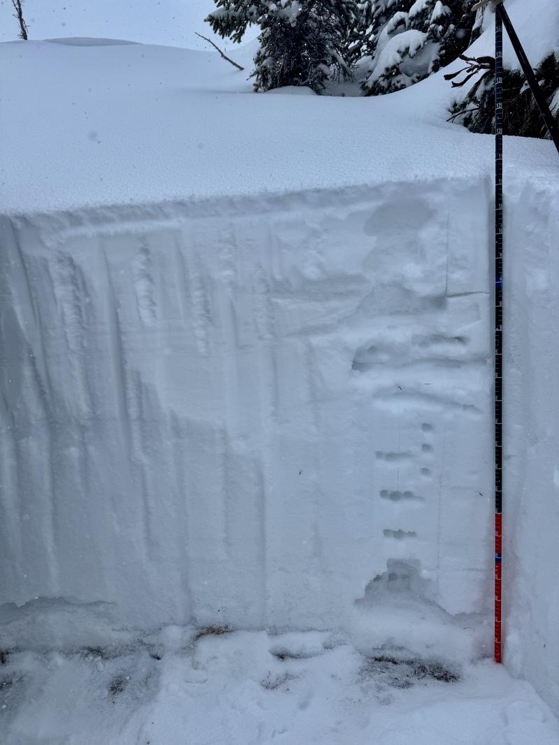 Total height of snow was 44" (113cm). We got extended column tests without propagation 3' (89cm) from the ground under the newest snow on a layer of faceted grains. This snowpack showed us very weak structure and we did not believe that where we dug had enough recent snow or wind loaded snow to be a problem just yet. As the storm moves through this danger will increase particularly if stiffer wind drifts load in on top of this weak faceted snow. The weak faceted snow (first hard) 12"" (25cm) from the surface was smooshing straight to the ground. This layer will not support much weight.