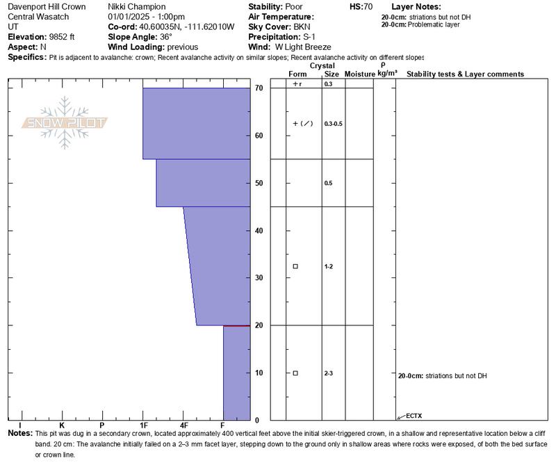 At the crown, we observed a 1F to 1F- slab composed of precipitation particles and wind-broken precipitation particles sitting on a layer of weak faceted snow. The primary failure layer was roughly 20 cm above the ground, resting on well-developed 2–3 mm facets. In shallower areas or spots with visible rocks, the avalanche stepped down to the ground.