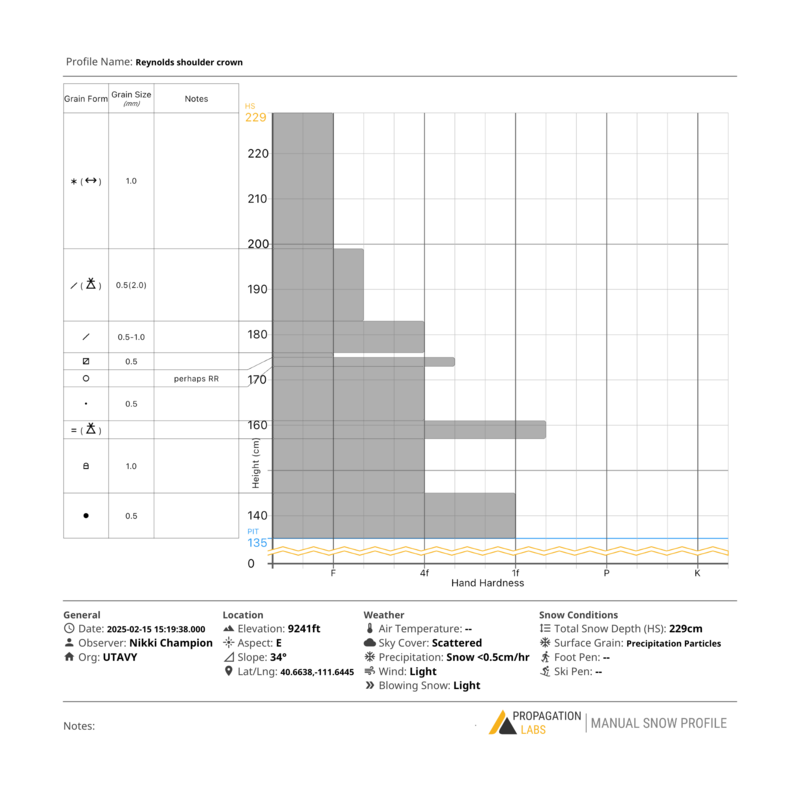 We were able to traverse the ridge and get into the crown to dig a profile. We dug on an east aspect at 9,241'; at this point, the slope was 34 degrees. The avalanche failed on small-grain facets directly above a fragile 4F+ crust, possibly a radiation recrystallization crust. This was interesting, as it was about 15 cm above the stout rain crust interface that formed earlier in February. The avalanche did not appear to have stepped down anywhere but seemed very well connected. This crust has been noted in a few other recent avalanches, particularly at mid and lower elevations and on aspects with a bit of a solar tilt.