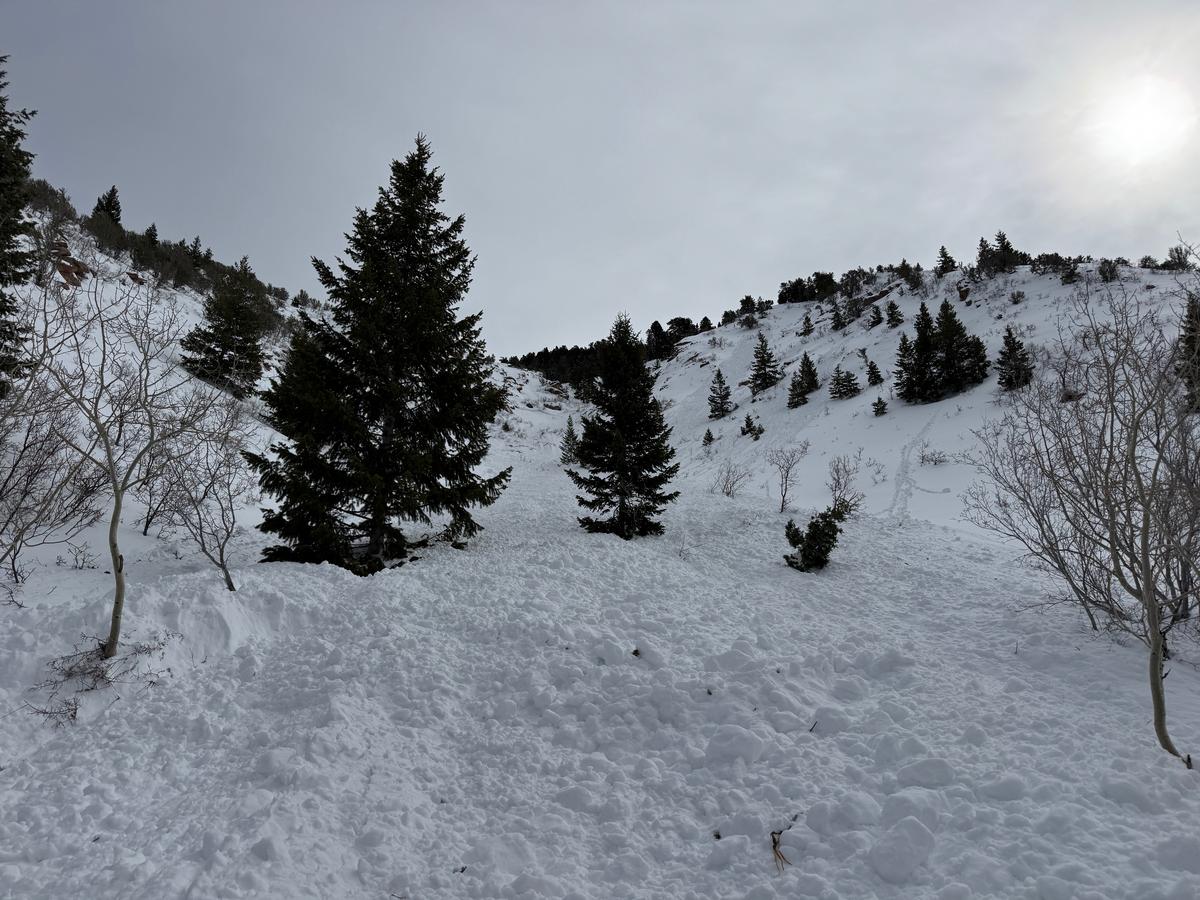 We went to look at the site of an avalanche accident from Saturday February 22nd involving one skier that was caught, carried, partially buried with minor injuries while ascending the slope. We found an avalanche that was 2' deep at the max and averaged 1' deep. It was 150' wide and ran 1400' vertical feet terminating in the aspens and scrub oak low on the slope. In the middle of the avalanche it was over 300' wide and entrained more snow eventually turning into wet debris at the toe. This individual was caught while ascending and was very lucky to have stopped higher on the avalanche path. The weak layer in this case was a soft (fist hard) layer of broken precipitation particles that was very thin. It was made up what we identified as needle grains that still had sharp edges.