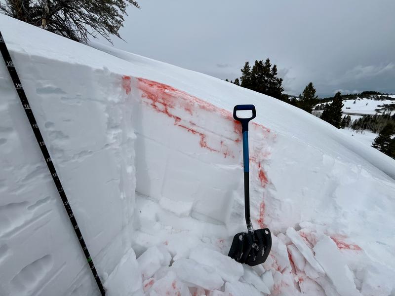 I was interested to see how the upper snowpack at mid-elevations handled the recent heat wave, and found moist to wet snow in the upper 70 cm (everything above the dust layer). Pouring some red dye on the snow revealed a barrier to water percolation 30 cm beneath the surface along an ice crust (picture below) and a few flow fingers, but did not seem to reach the mid-pack facets. As winter is expected to return this week and temperatures should continue to dip below freezing at night, the wet snow problem is decreasing.