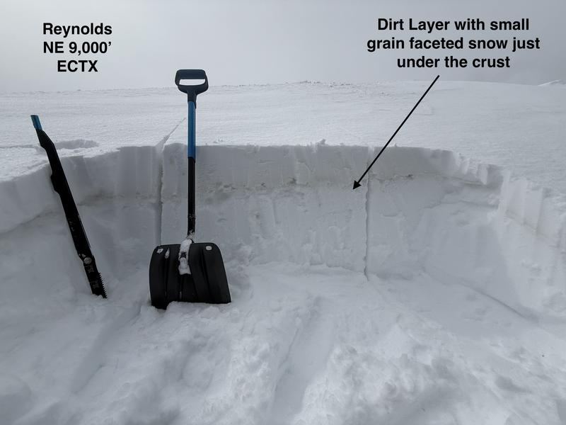 On northerly facing terrain, there was about 6 inches of new storm snow above the dirt/crust layer formed from high pressure and warm temperatures from February 22nd to March 2nd. This dirt/crust layer was buried March 2nd. Unfortunately, I did find small grained faceted snow (NSF) buried about 7" down in this location.