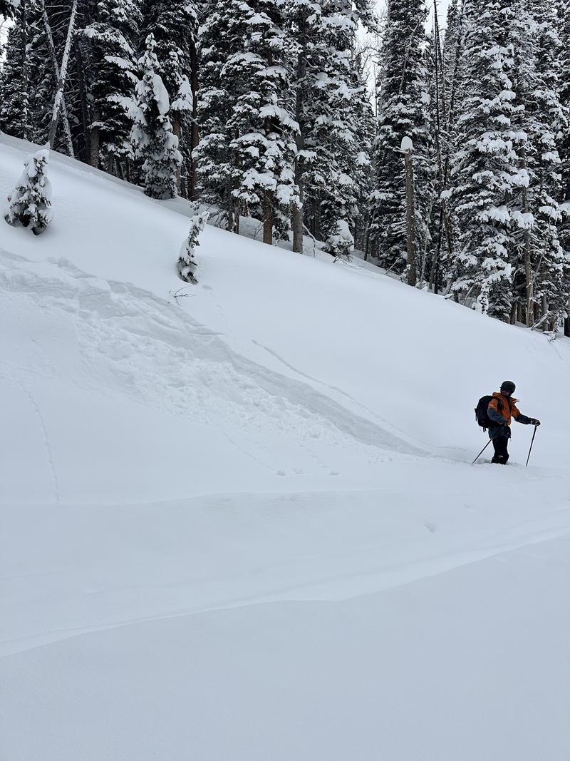 There seemed to be about 30–35 cm of medium-density new snow in the Guardsman area. The new snow appeared to be bonding well with the old snow surface, and steep test slopes showed some sluffing in the upper few inches. On steeper terrain at upper elevations, the snow seemed to entrain a bit more and moved fairly quickly.